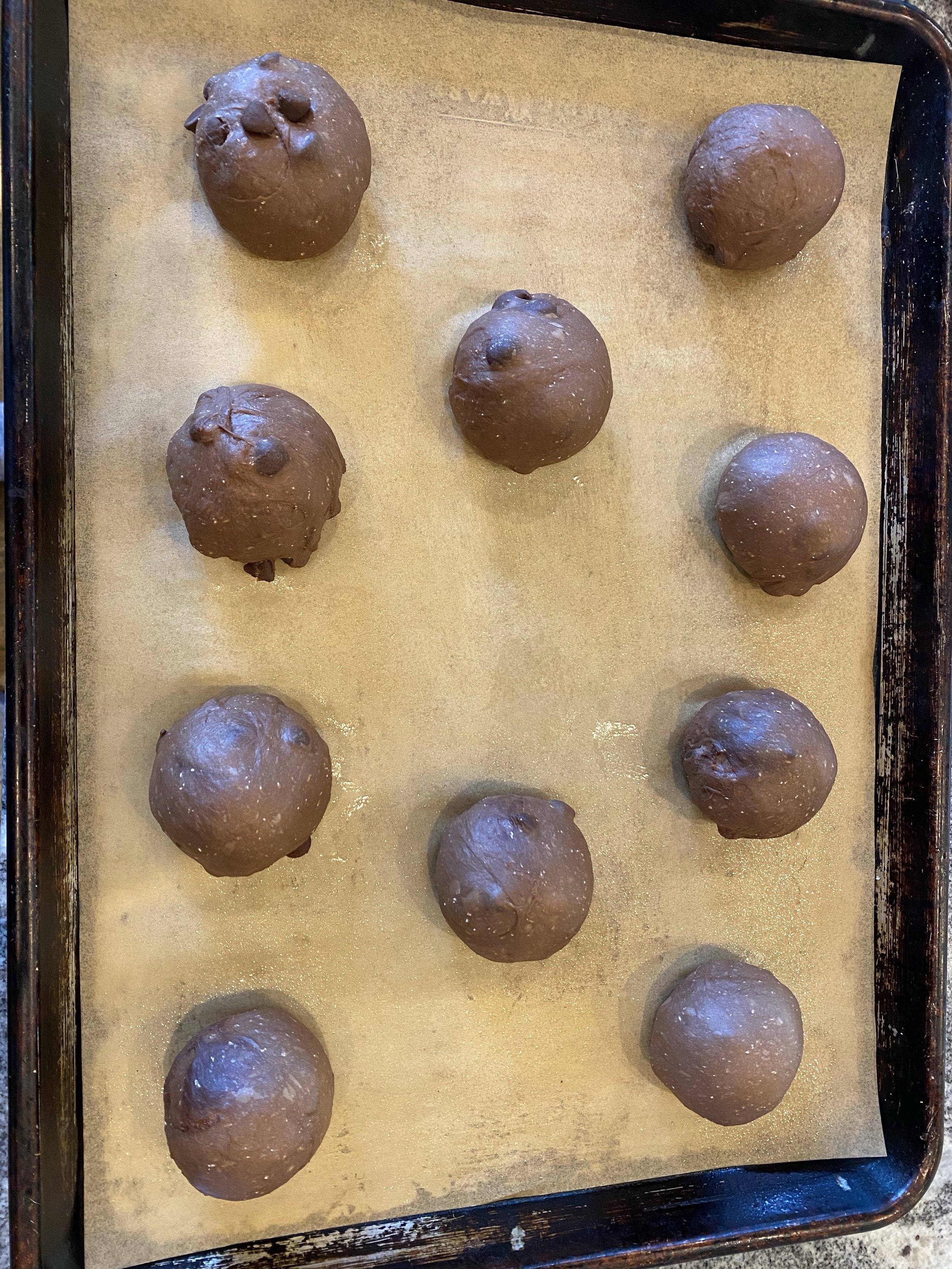 - Transfer the balls to a baking sheet lined with parchment coated lightly with spray oil and cover with plastic wrap for 15 minutes.