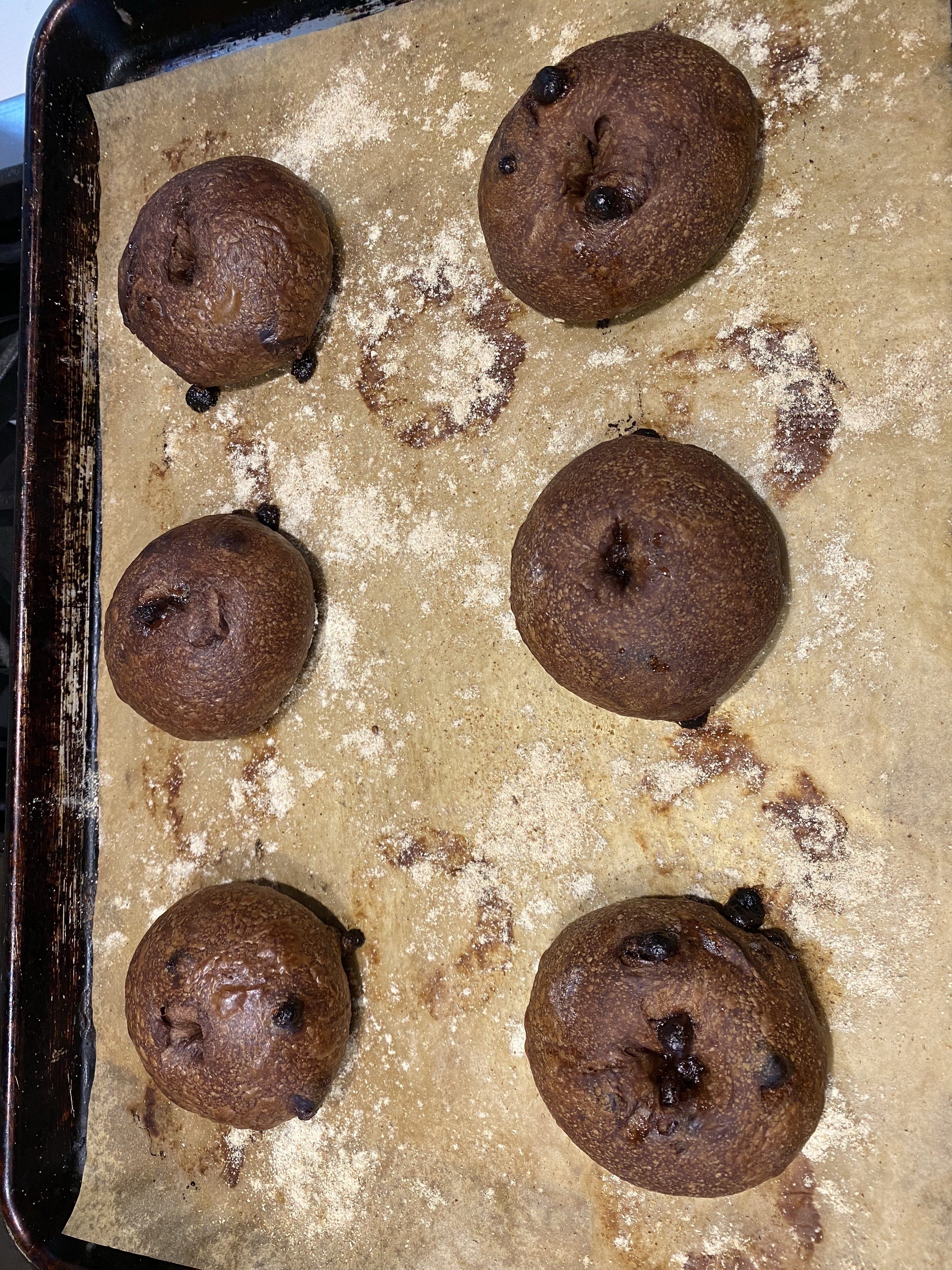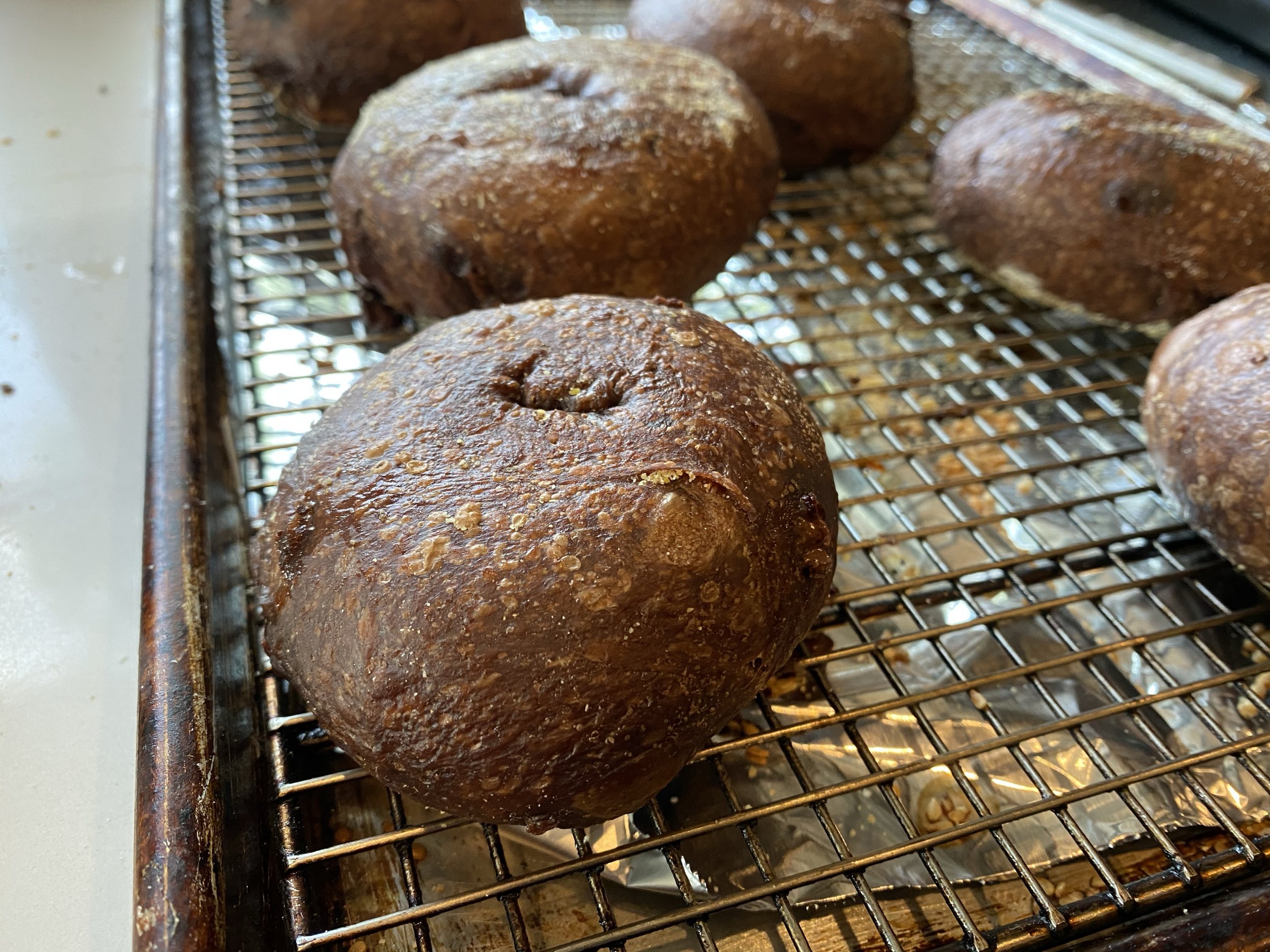 I wondered if my bagels were underproofed because I had use less than my customary amount of yeast, so I repeated the experiment with a full 4 g of yeast and this time the bagels had no problem floating. However, the poaching water darkened from chocolate chips melting on the surface and I realized that, given the lack of difference I had noticed earlier, it may not be worth boiling these bagels. Unlike regular bagels where the classic chew and crust are key components, this is a totally different beast (and certainly not adherent to any sort of historical precedent.