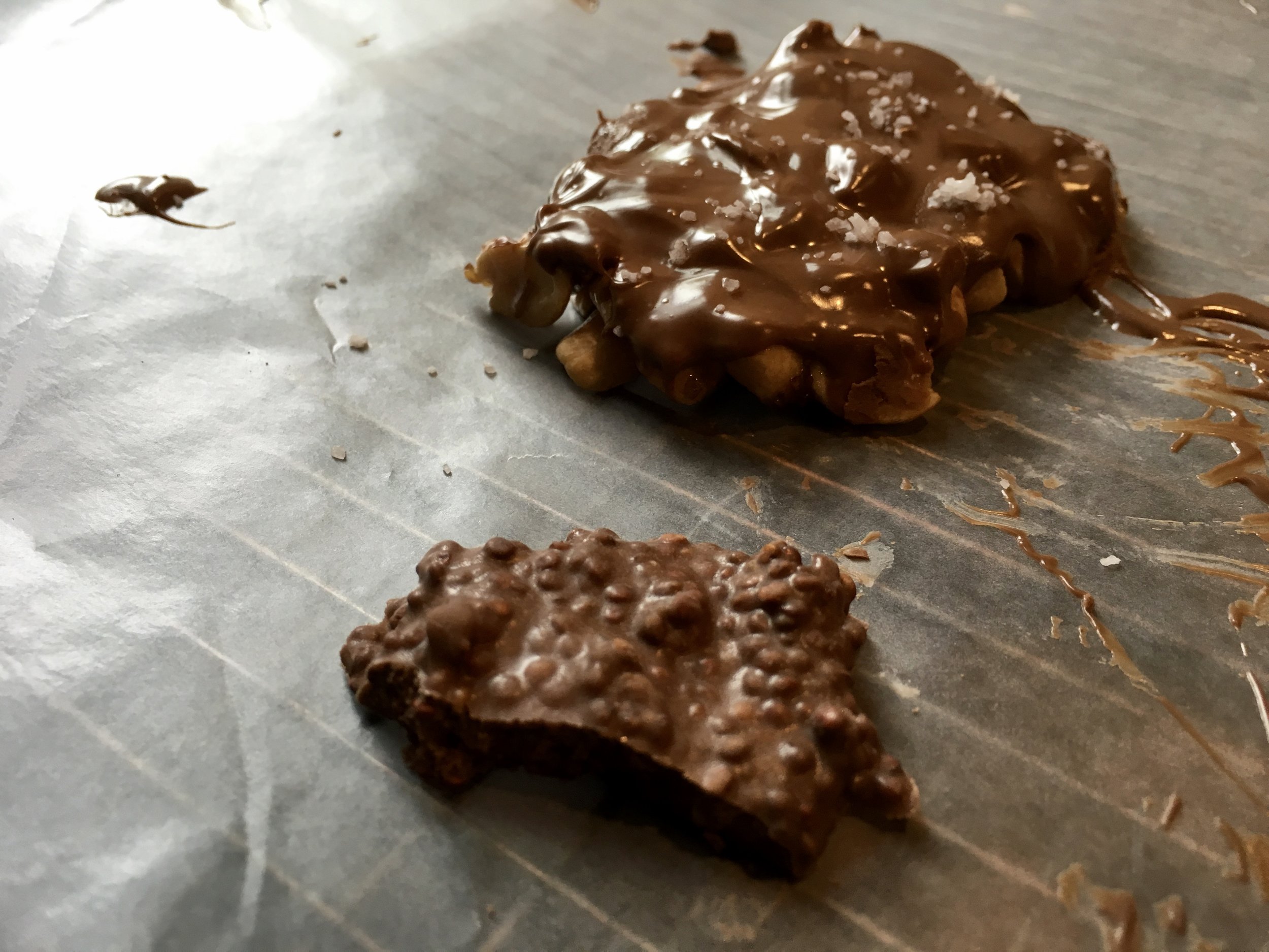 It would be fantastic if one could just melt chocolate wihtout much attention and mold it into whatever use came to mind, but that's not the case. Chocolate that has been simply heated without regard to temperature can form a streaky mess with off flavors. The right way to reshape a solid mass of chocolae is with "tempering": a controlled melting that eases the choclate into the narrow temperature window (around 90° F) where it is rendered malleable by the warmth, but not damaged by the heat.I did this recently via the traditional stovetop method using a double boiler (a bowl set over a pot of steaming water), with close monitoring of the temperature using an instant read thermometer (I use a Thermoworks Thermapen).I used the instructions from about.com, which essentially say to first heat up the chocolate to a relatively high temperature (110 °F for white or milk, 115 °F for dark), then cool to a working temperature (87 °F for white/milk, 90° F for dark). While it seems a bit finicky in the descriptions online, I found it reasonably easy so long as you are patient.I used this approach to make a peanut chocolate cluster and a red quinoa "Crunch" bar. The sous-vide approach to tempering described at Serious Eats seems like an even easier way to go. The same process is followed as above, but allows you to perform it all via a sous vide machine. The chocolate sits in a vacuum-sealed bag and only requires occasional agitation.