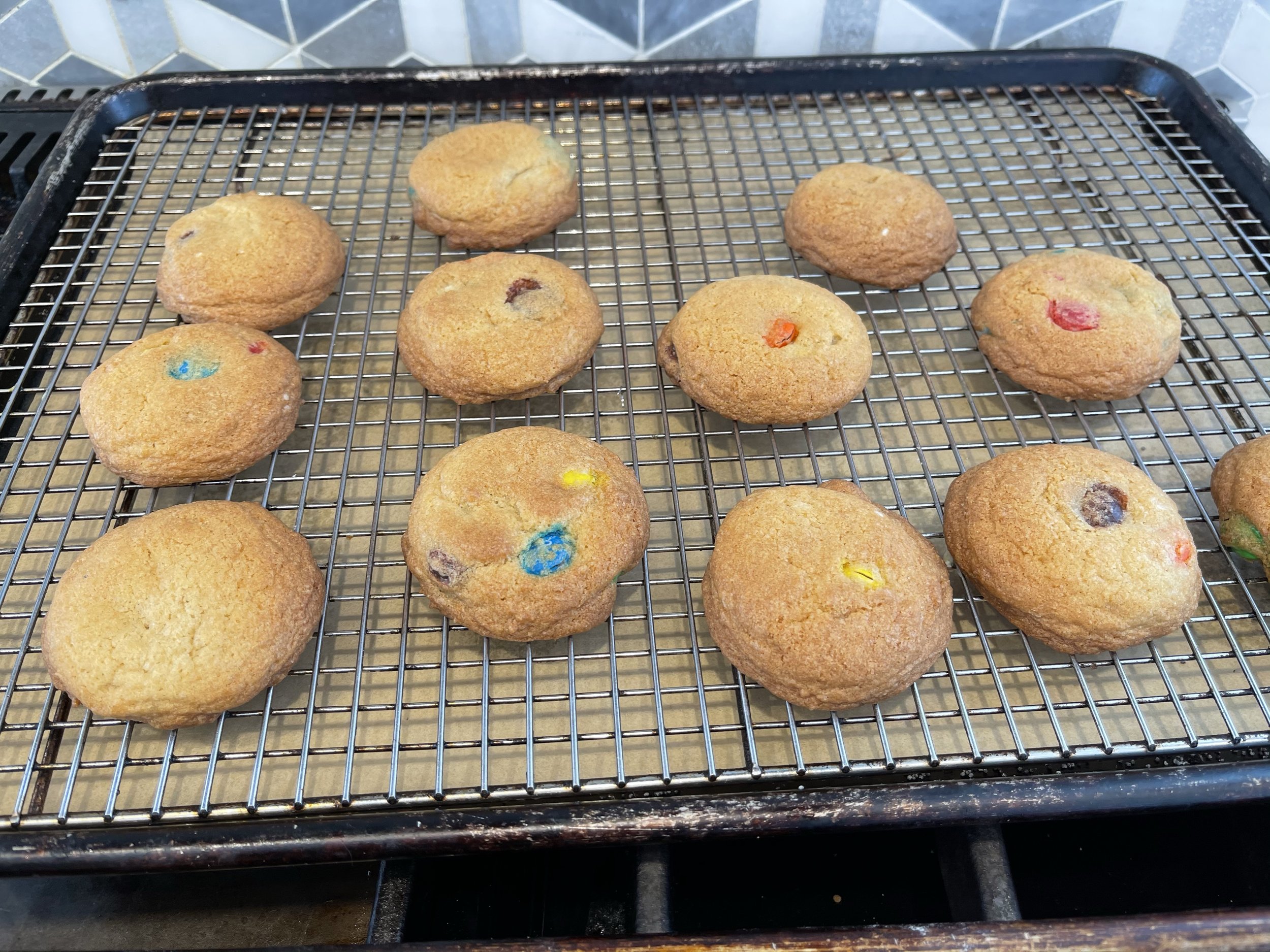 Using my M&M Cookies recipe, I decided to test put the theory to the test. Though I normally cook only one tray at a time, I still rotate it 180° midway through. I cooked one batch the usual way at 375 °F for 10 minutes. For the next batch, I decreased the temperature to 350 °F (a 25° F decrease is typically recommended when switching to convection). I typically rest my cookies on the sheet pan for about 3 minutes after they come out of the oven, to finish baking without drying out.