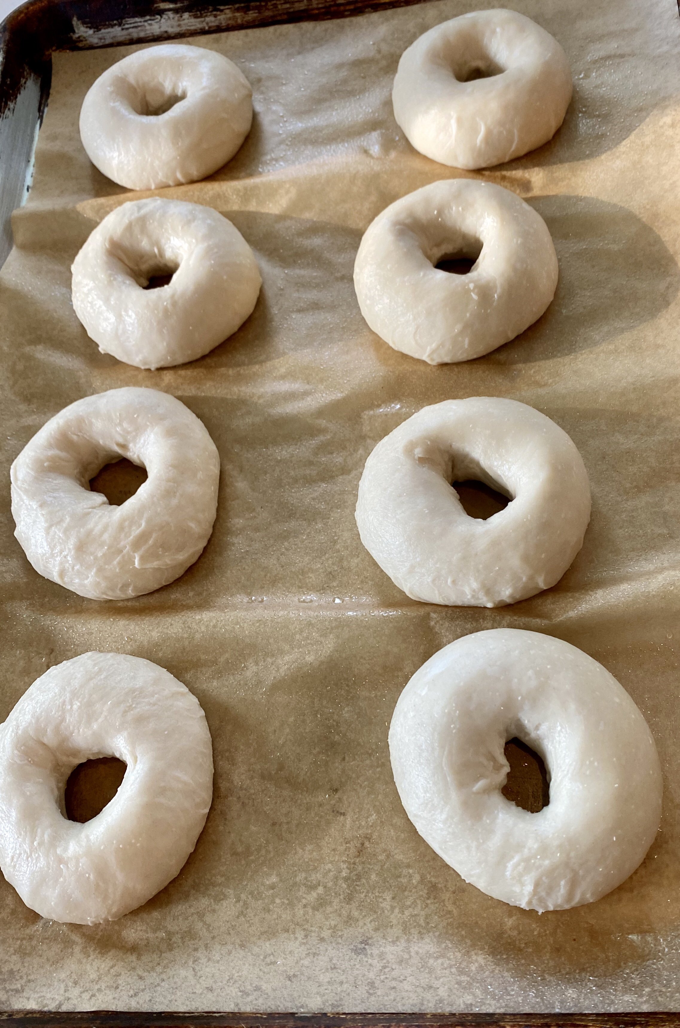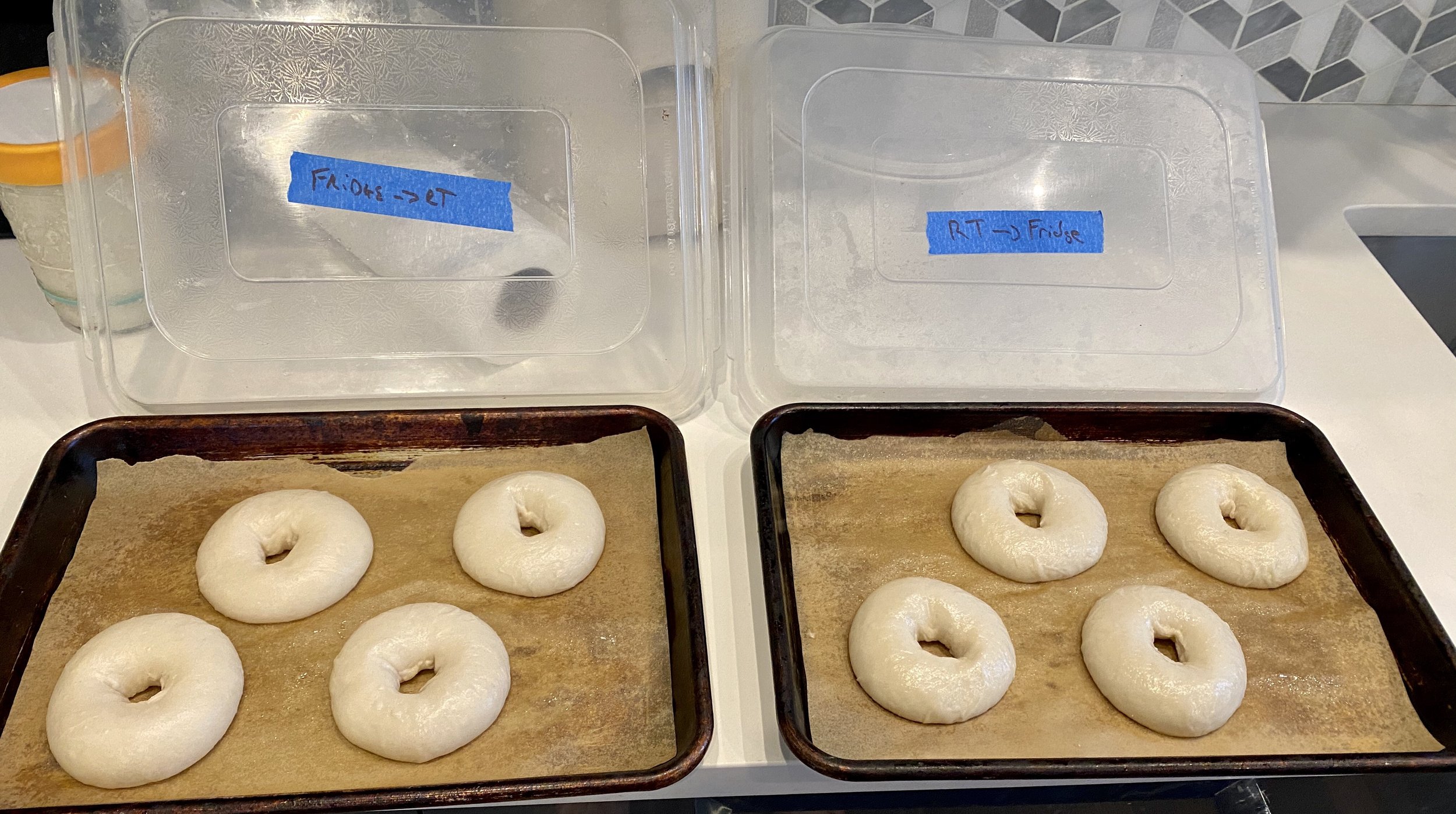 I continued making efforts over the subsequent days, trying various techniques to improve the results: I added longer room temperature proofs, including up to 12 hours, and even did a controlled experiment, with half the batch at room temperature for 12 hours followed by 12 hours in the refrigerator, and half the other way around (a classic switch study). Bottom line: they were no different. Both rose somewhat, but failed to float on the initial drop into the water bath. I was left with the same textural problems.