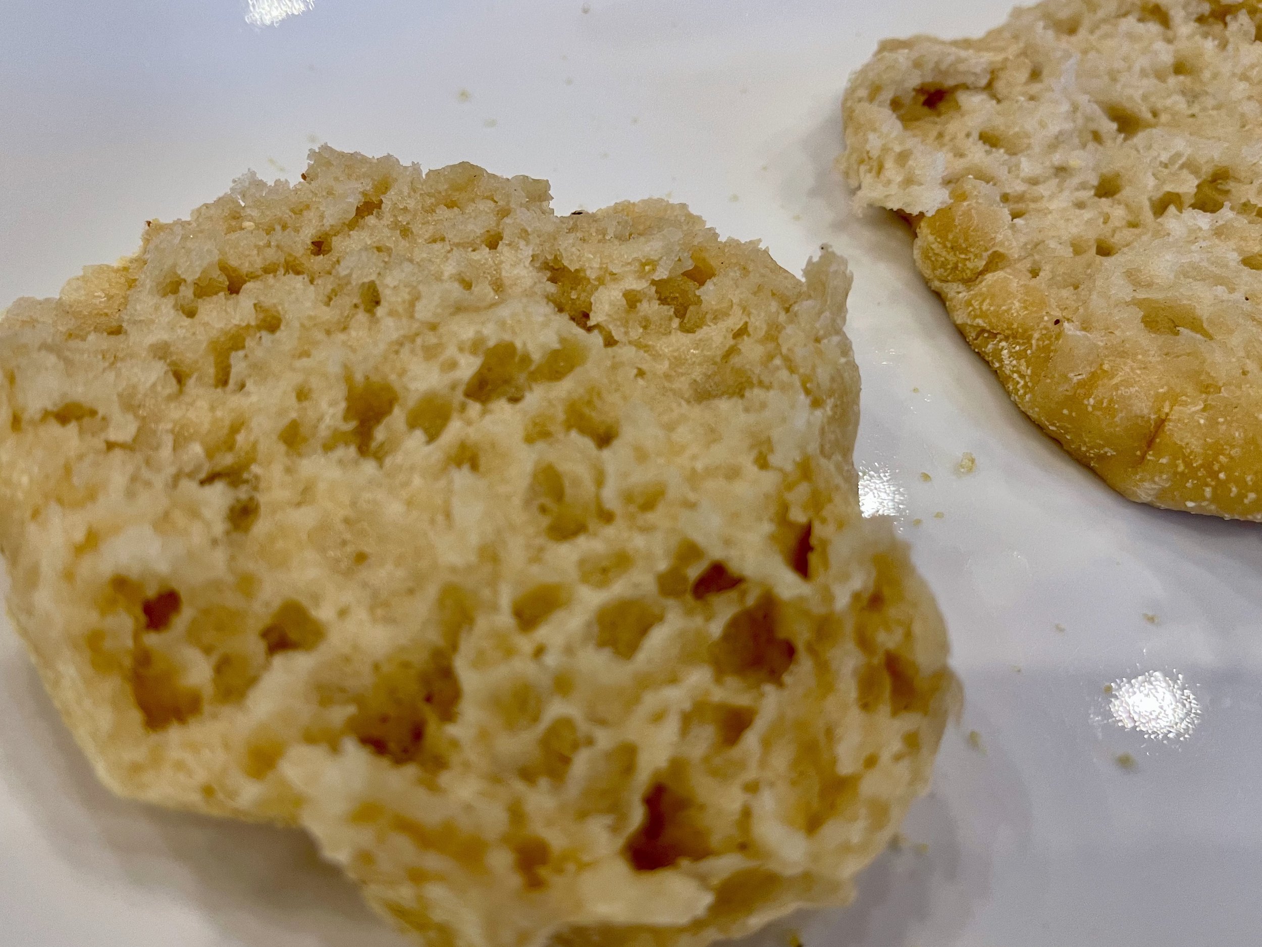 Although most people don’t place English muffins in a category of haute cuisine, they are a workhorse that can meet a number of breakfast tastes. They were a rare sight at our breakfast table, but since my family enjoys various bread and egg combinations with increasing regularity, their absence became increasingly striking. I hoped I could find a recipe that exceeded the occasional store-bought option.