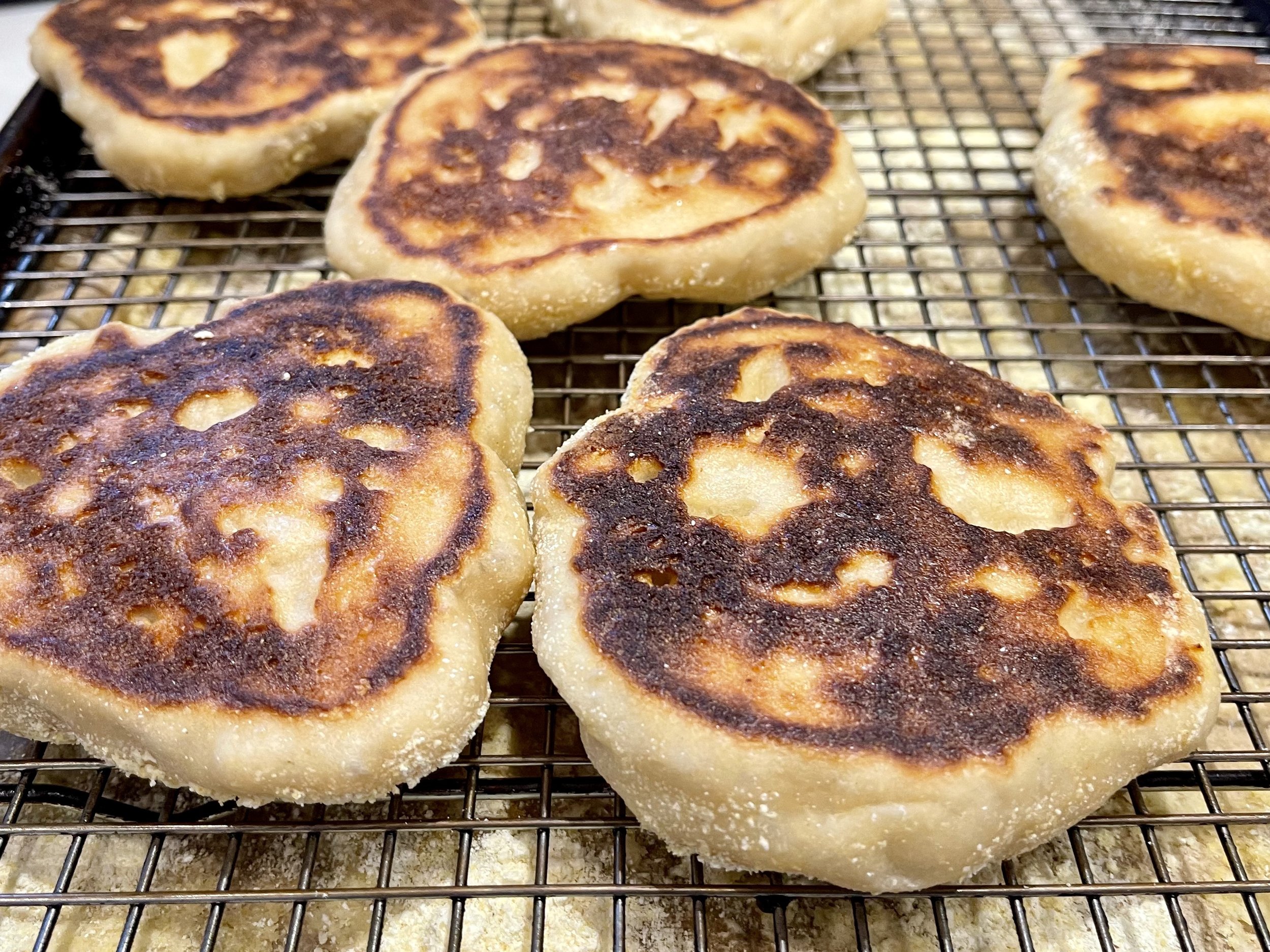 After a long hiatus, I recently returned to Parks’ recipe, this time using home-ground whole wheat flour and a 80 grams of a sourdough starter in place of 40 g each of the white flour and milk. I typically gave the muffins an overnight rest prior to griddling, but Parks’ allows for up to 42 hours, so I waited an extra day. For a less-greasy profile, I skipped the butter she called for on the griddle, and just lightly oiled the griddle so the muffins wouldn’t risk sticking (this also reduced the near-burning I had occasionally experienced from the added honey). The results were a hit with the whole family when served as egg sandwiches. The muffins are slightly sweet, but not overly so, and have a great texture.