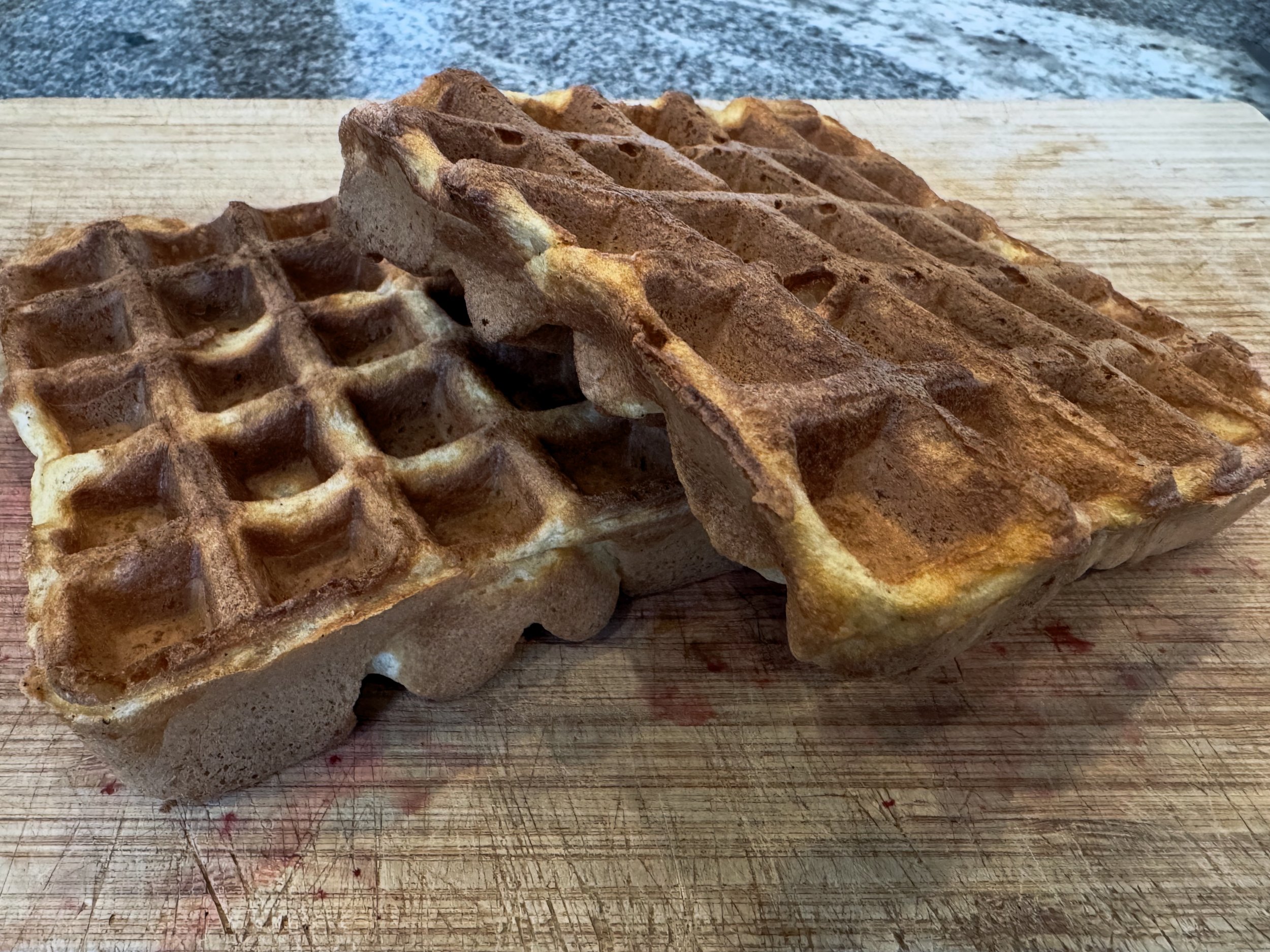 The answer was yes.. The result is what I call the Vanilla Angel Waffle, given the inspiration from angel food cake. If your idea of a waffle requires a buttery, rich delicacy closer to a croissant, then these are probably not the waffles for you. On the other hand, if a lighter, crispy waffle piques your curiousity, give these a try. Note that these are not “healthy” waffles or some scaled-back “low fat” version designed to make you feel better about yourself. The recipe is designed to achieve a specific texture and taste, and I believe they have done that.